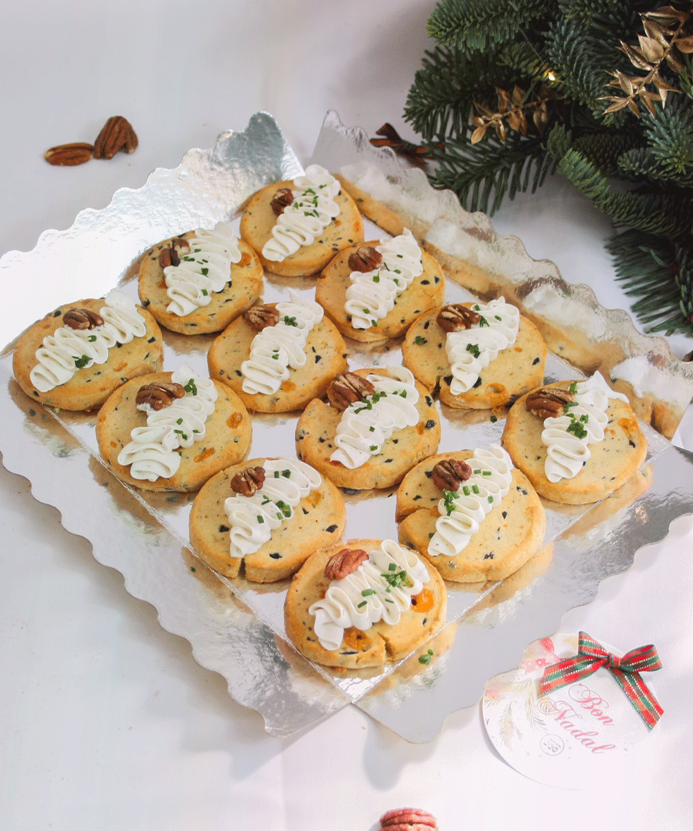 Una combinación irresistible de galletas crujientes de parmesano acompañadas de una suave y aromática crema de queso trufado. Presentada en una bandeja lista para llevar directamente a la mesa, es la opción perfecta para completar una cena de Navidad o Nochevieja con un toque gourmet y sin complicaciones. Ideal para compartir y sorprender a tus invitados. 🎄✨