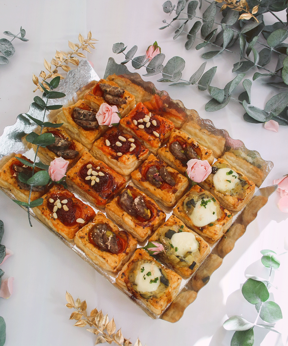 Surtido de hojaldritos con tomate cherry y rellenos de distintos sabores: