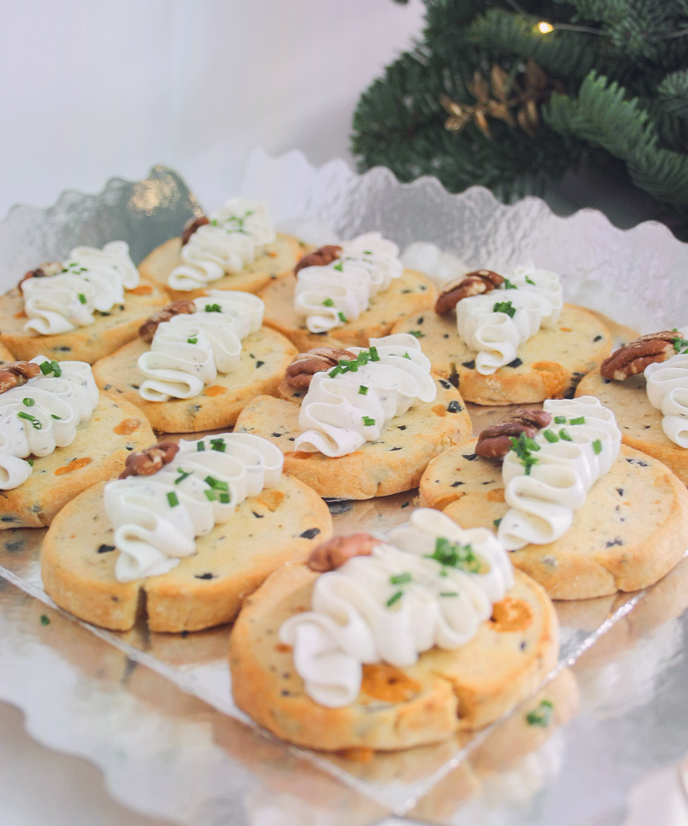- Bandeja de 12 galletas saladas de parmesano con queso trufado y nueces.