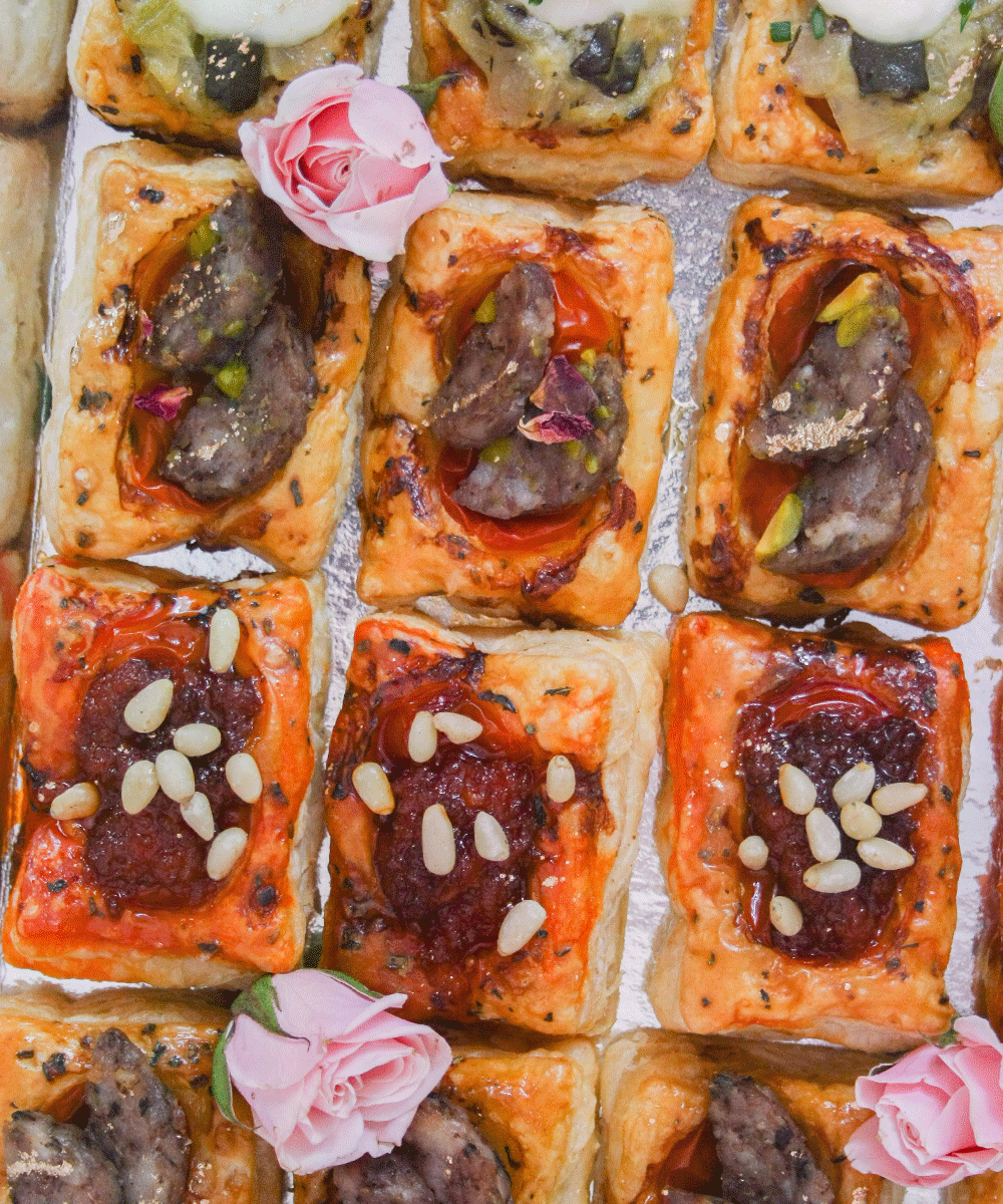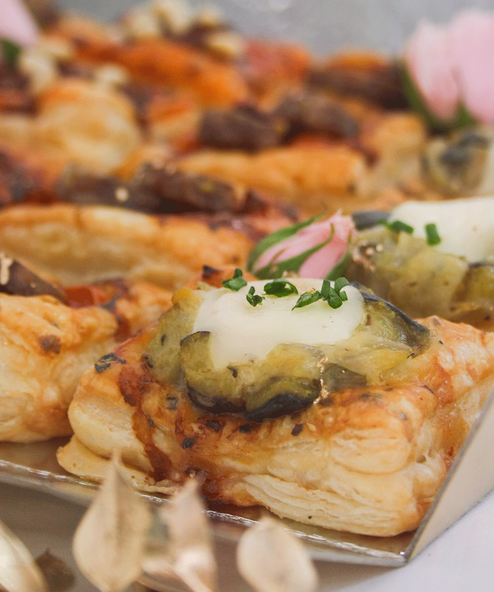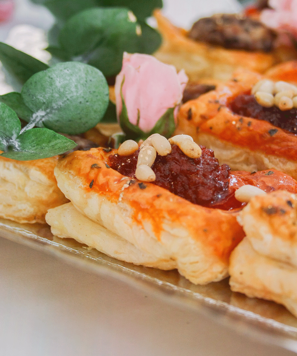 - Bandeja de 16 hojaldres de cherrys con: blanquet de trufa, sobrasada con miel y piñones, blanquet de pistacho, cebolla con calabacín y mozzarella.