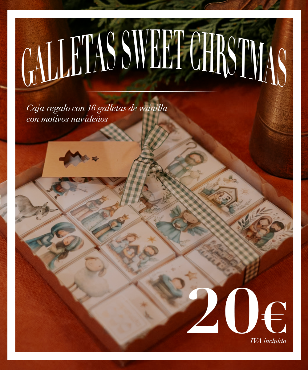 Caja regalo con 16 galletas de vainilla con motivos navideños en impresión de azúcar.